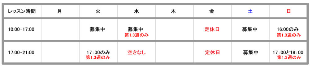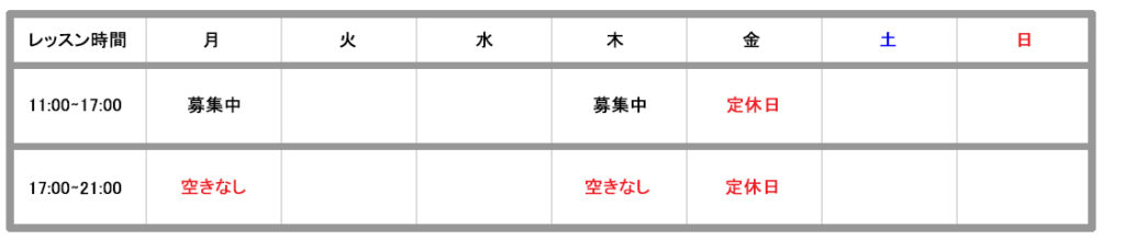 教室レッスン日 空き状況